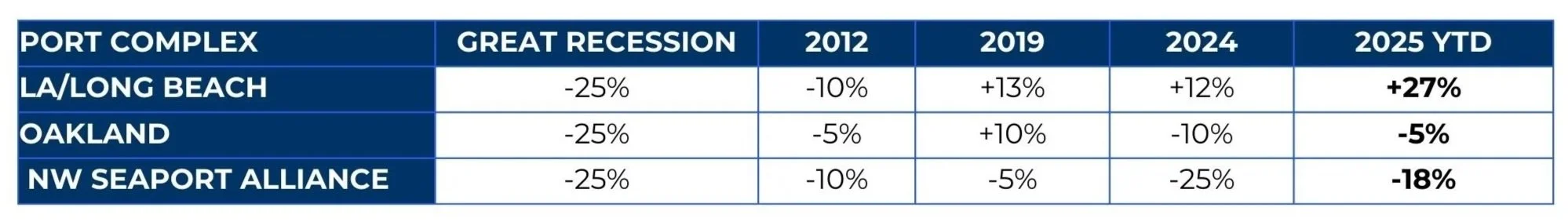 Oakland and the Puget Sound ports never saw that rebound, and current performance trends are actually mirroring those that we haven’t experienced since the Great Recession.