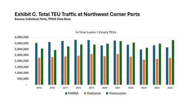 Now, where should British Columbia’s Port of Vancouver go in the Four Corners scheme? It, rather than Northern California’s Port of Oakland, is the rival against which the Northwest Seaport Alliance most directly competes for containerized business, as Exhibit C indicates.
