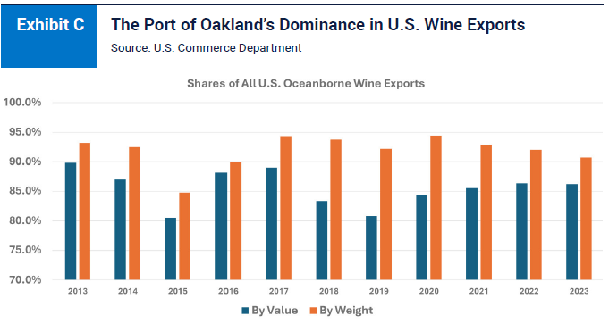 Given the geography of wine production in California, it should surprise no one that the Port of Oakland dominates the wine export trade, as Exhibit C demonstrates.