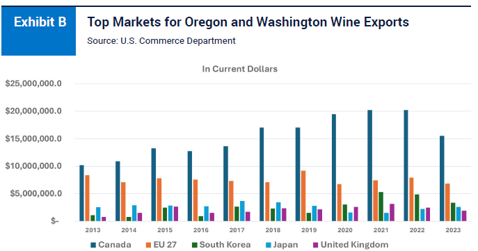 U.S. Commerce Department trade data presented in Exhibit B reveal a similar pattern of market concentration for wines being shipped from Oregon and Washington.