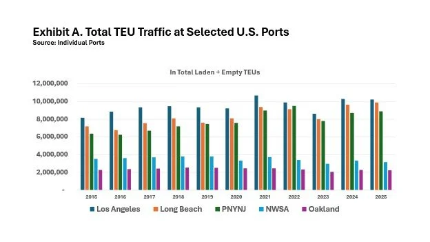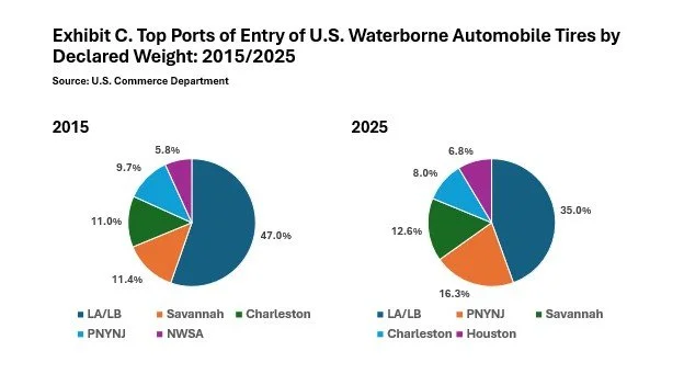 Along the U.S. West Coast, the tonnage share of U.S. tire imports arriving at the Northwest Seaport Alliance Ports of Tacoma and Seattle fell from 5.8% in 2015 to 4.2% in 2025. Meanwhile, the share of tire import tonnage entering through the Port of Oakland increased from 1.3% to 2.3%.