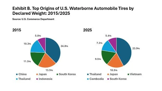 Exhibit B compares the leading sources of U.S. waterborne imports of automobile tires in 2015 and 2025 ranked by declared weight. As a supplier of car tires to the U.S. market, China has clearly dropped from the picture.