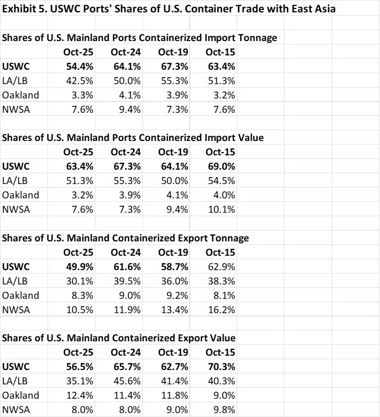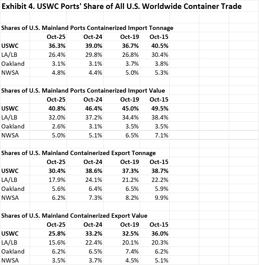 Reflecting the turbulence in trade with China, the October share figures show particularly dramatic fall-offs in the USWC shares of America’s containerized trade with China.