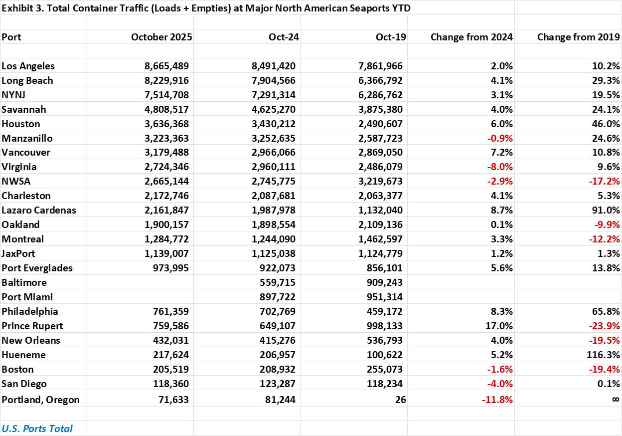 For the month of October alone, the Port of Los Angeles saw the number of inbound loads in October drop by 7.2% from a year earlier but remain 9.3% above the volume recorded in October 2019. Meanwhile, outbound loads edged up 0.9% from a year earlier to 123,768 TEUs. Total 2025 YTD container trade through the nation’s largest container gateway of 8,665,489 TEUs was up 10.2% from the first ten months of pre-pandemic 2019.