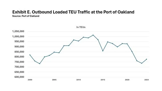 Exhibit D displays the volume of outbound loaded TEUs shipped from the Ports of Los Angeles and Long Beach over the past quarter century.
