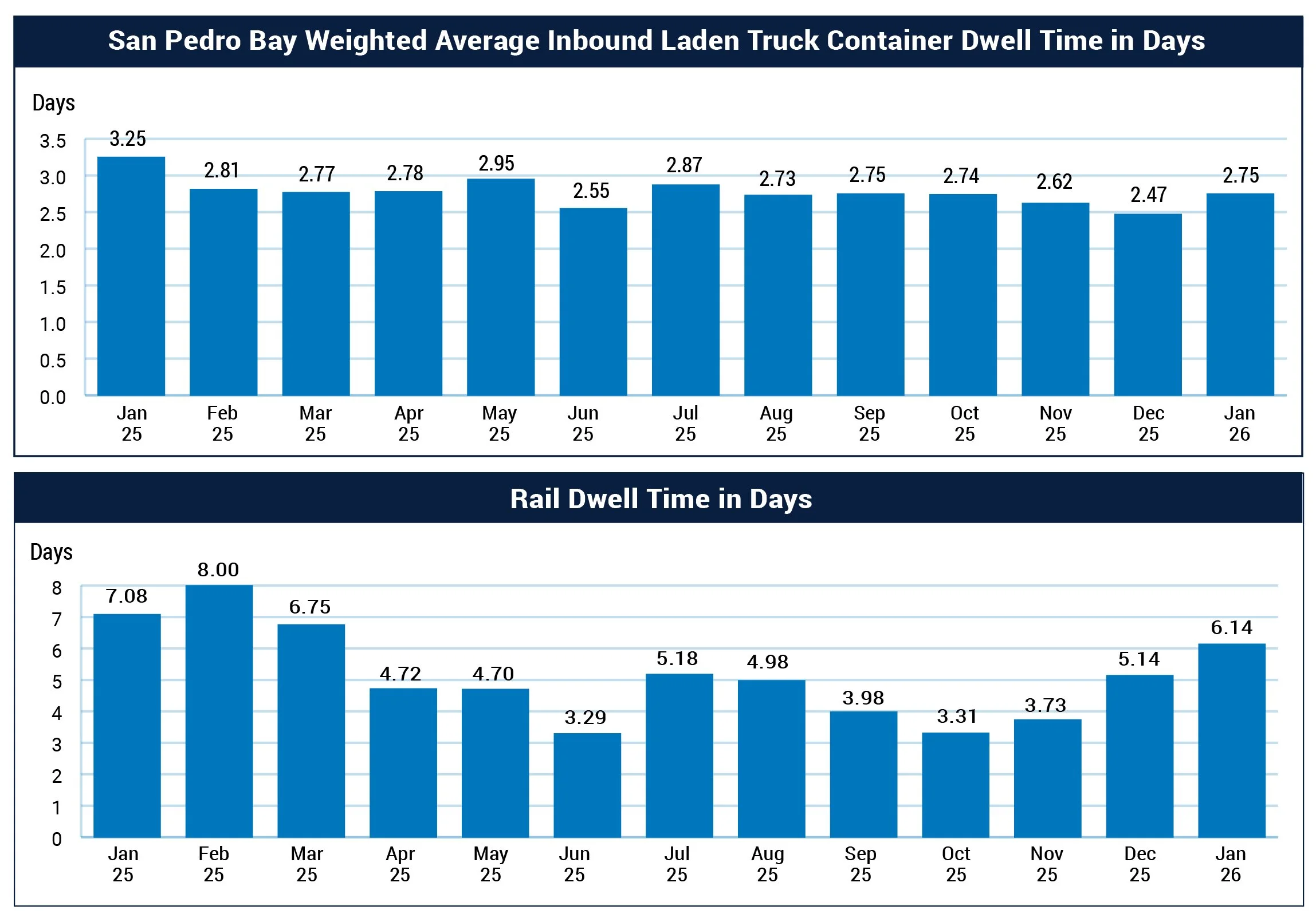 Container dwell times at the San Pedro Bay Port Complex opened 2026 reflecting continued operational fluidity across marine terminals, with truck cargo velocity remaining strong and rail performance adjusting from December levels.