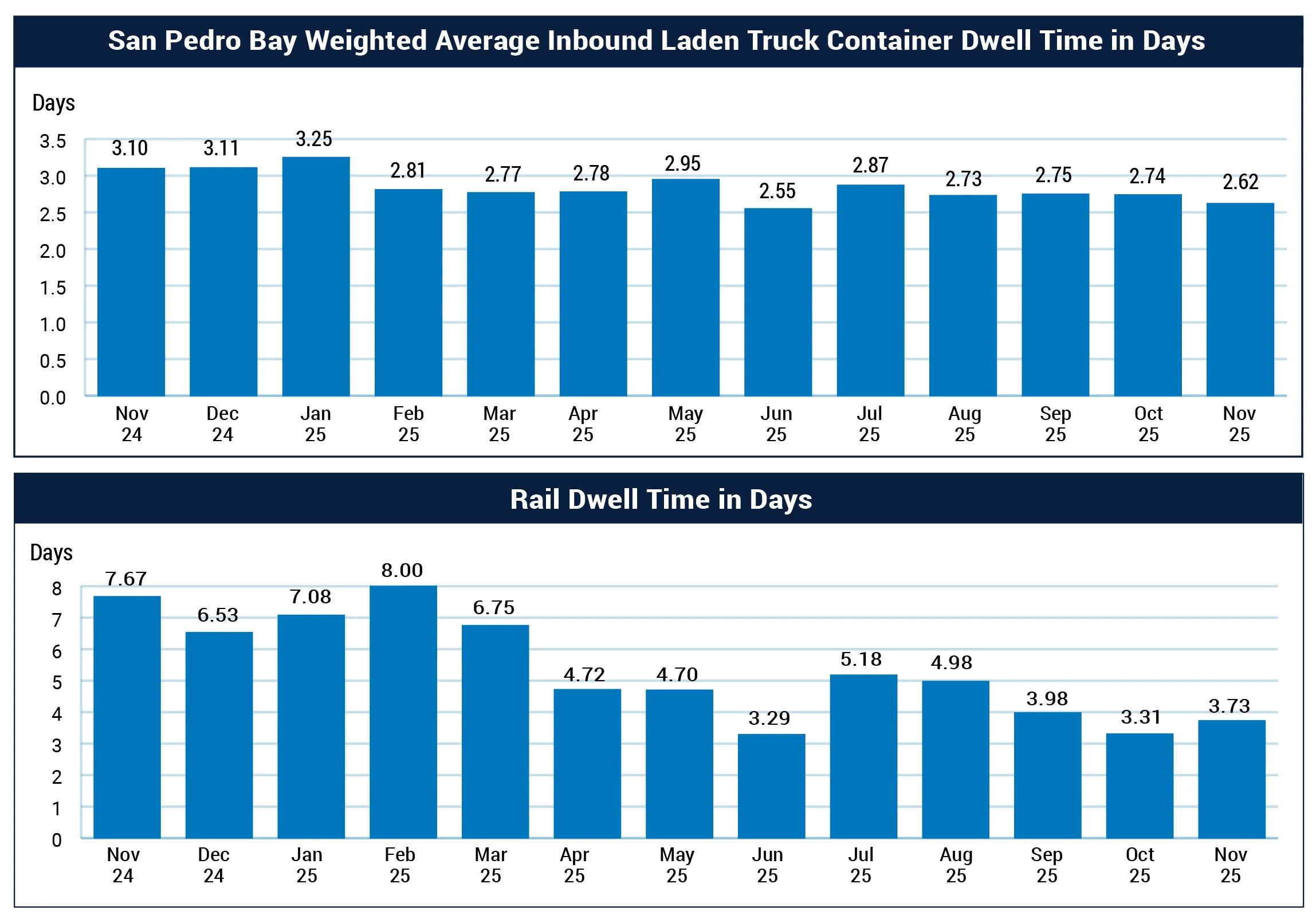 Container dwell times at the San Pedro Bay Port Complex remained consistent through November 2025, reflecting ongoing operational stability as the holiday season reached its peak. Both truck- and rail-destined cargo continued to move efficiently, supported by sustained coordination among marine terminal operators, drayage partners, and rail providers.