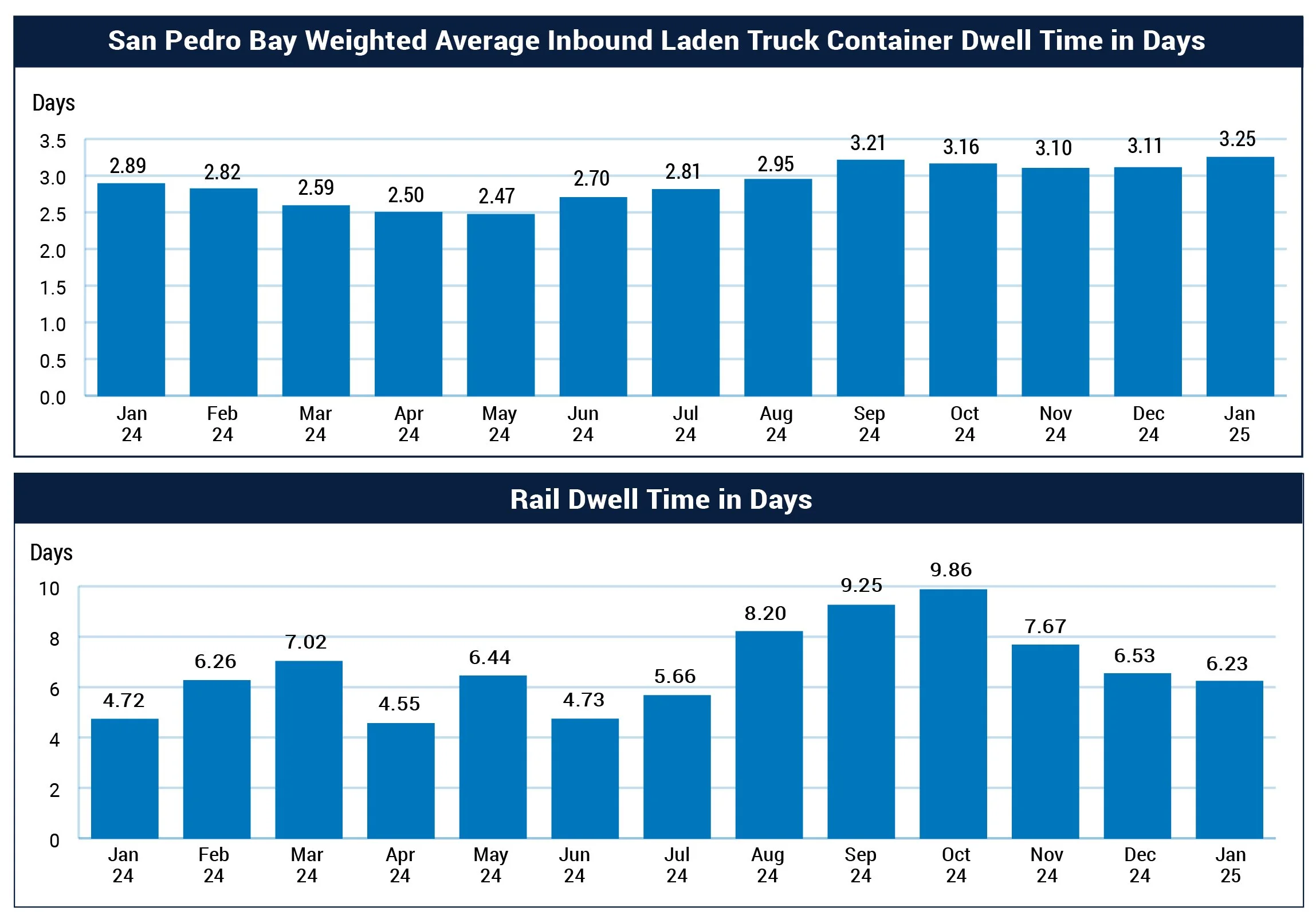 January dwell time data for the Ports of Los Angeles and Long Beach showed slight improvements in rail-destined containers following a spike in October 2024, while truck-destined container dwell times remained consistently low and steady.