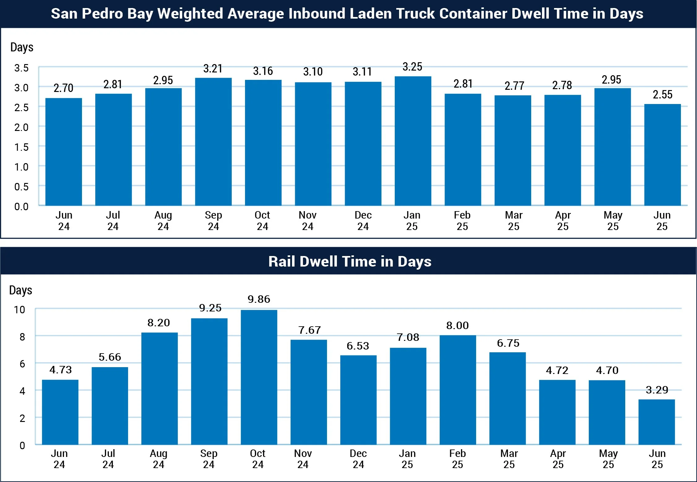 In June 2025, dwell times at the Ports of Los Angeles and Long Beach continued to reflect consistent operational performance across both truck and rail modes, despite ongoing instability in cargo volumes. Notably, rail-destined cargo dwell significantly improved, dropping to 3.29 days, representing the lowest average recorded rail dwell since December 2021. This impressive performance, reflecting improved inland cargo movement and greater supply chain velocity, marks a substantial reduction from the previous month’s average of 4.70 days, a 30% decrease compared to the same time last year and reflects enhanced coordination between marine terminals and railroad operators.