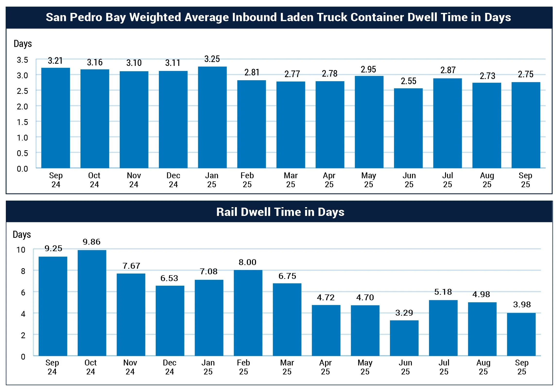 The Ports of Los Angeles and Long Beach continued to demonstrate efficient cargo movement through September 2025, maintaining fluid operations. Container dwell times for both local and rail-bound cargo remained within healthy ranges, reflecting the continued strength and adaptability of the San Pedro Bay Port Complex.