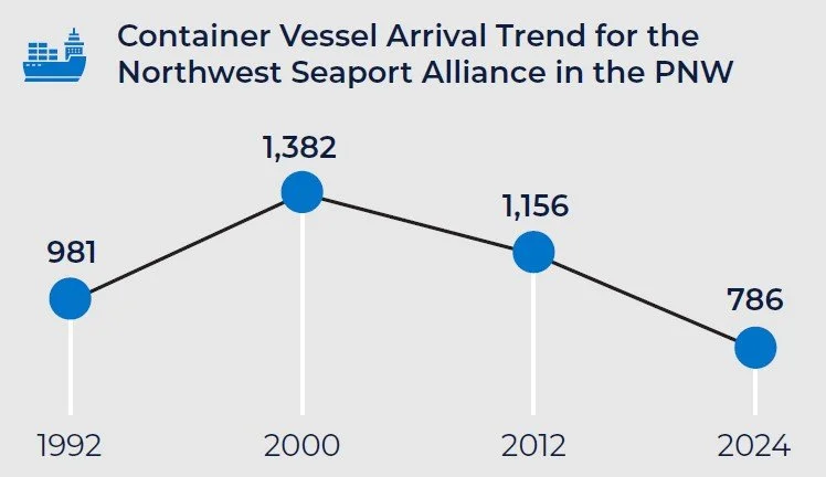 What’s driving the downward trend in the PNW? The shift stems in part from increased use of more-efficient, newer, and larger container ships which are transporting more containers per visit. In other sectors, some vessels — like log carriers — have nearly vanished. Bulker arrivals that included log carriers, for instance, fell from 1,119 in 1992 to just 279 last year. Each port has its own story, but a consistent trend is clear: fewer ship calls are needed to manage rising cargo volumes especially in the container sector.
