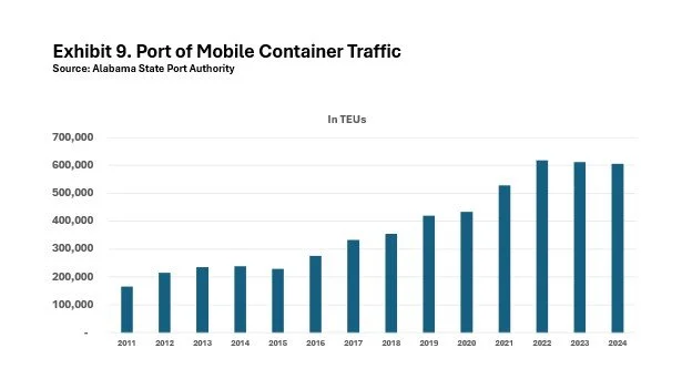 The Alabama State Port Authority (ASPA) does not routinely post statistics on container operations at the Port of Mobile. There are no monthly reports about TEU traffic, and the most recent information about container volumes comes in the back pages of the ASPA’s Annual Comprehensive Financial Report, the latest of which covers its 2023-2024 fiscal year.